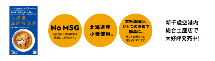 「No MSG」を掲げたこの北海道海鮮塩湯麺。「No MSG」とは、化学調味料(グルタミン酸ナトリウム)を使用していないということ。実はこの「No MSG」、生ラーメン商品業界の中では非常に珍しく、画期的なことなのです。